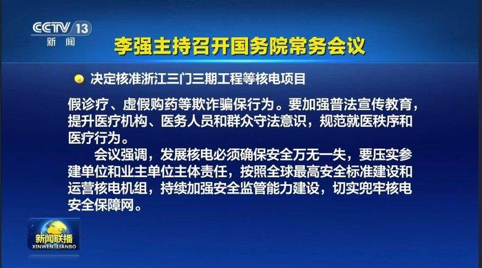 4月27日,据央视新闻报道,国务院总理李强主持召开国务院常务会议,决定核准浙江三门三期工程等核电项目。
